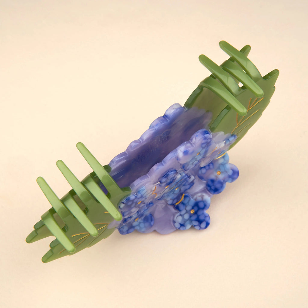 Con sus delicadas flores en tonos azul lavanda y púrpura moteado, y sus hojas verde mate con nervaduras doradas, esta pinza es una obra de arte hecha accesorio. Está elaborada en acetato de celulosa biodegradable, lo que la convierte en una opción consciente y sostenible para quienes buscan belleza sin renunciar a valores éticos.