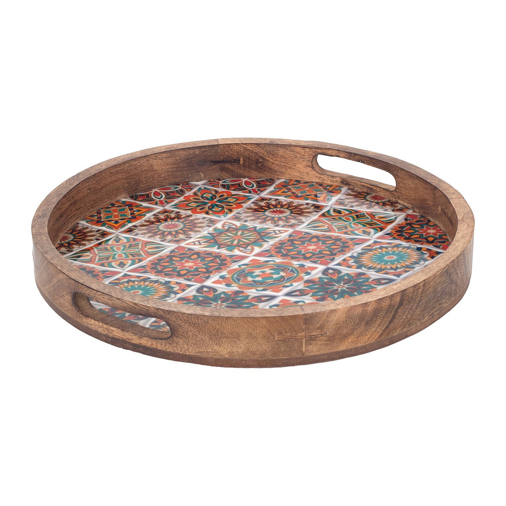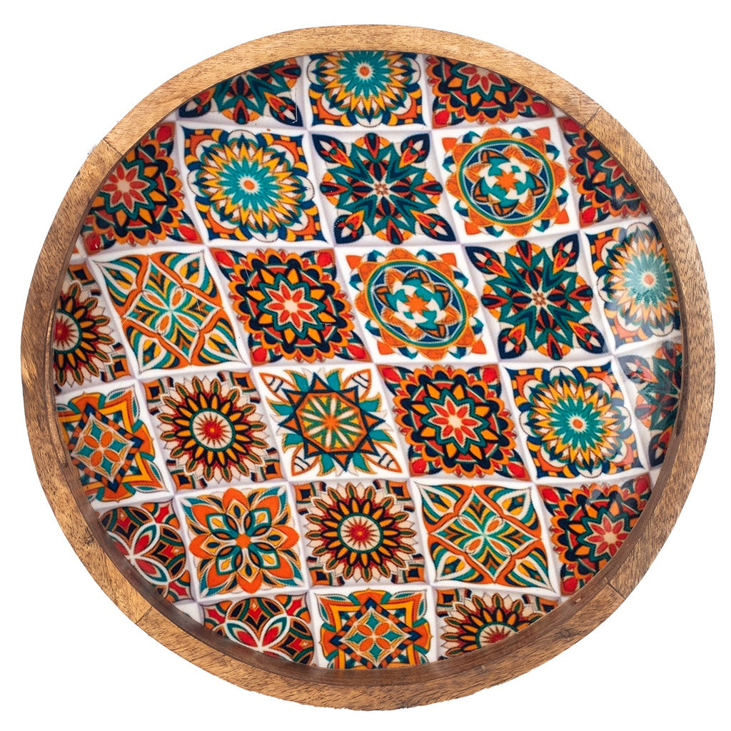 La bandeja redonda de madera con motivo de mosaico de azulejos de colores es mucho más que un accesorio funcional: es una pieza decorativa que aporta personalidad y encanto mediterráneo a cualquier espacio. Su diseño combina la calidez de la madera natural con un espectacular motivo de mosaico de inspiración artesanal, lleno de geometrías y tonalidades vibrantes.