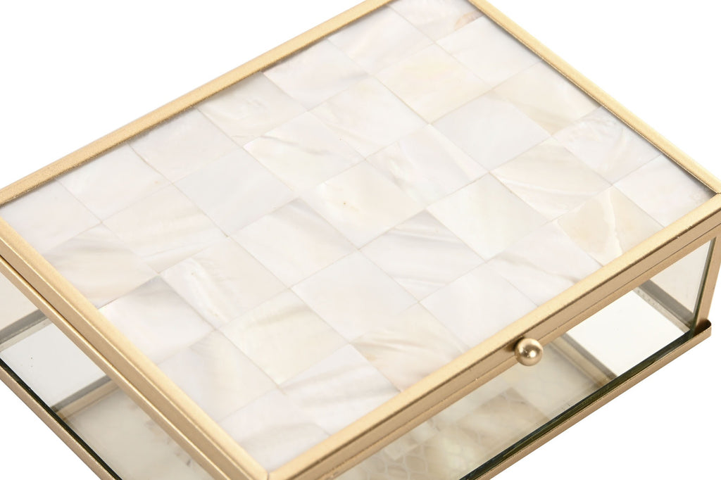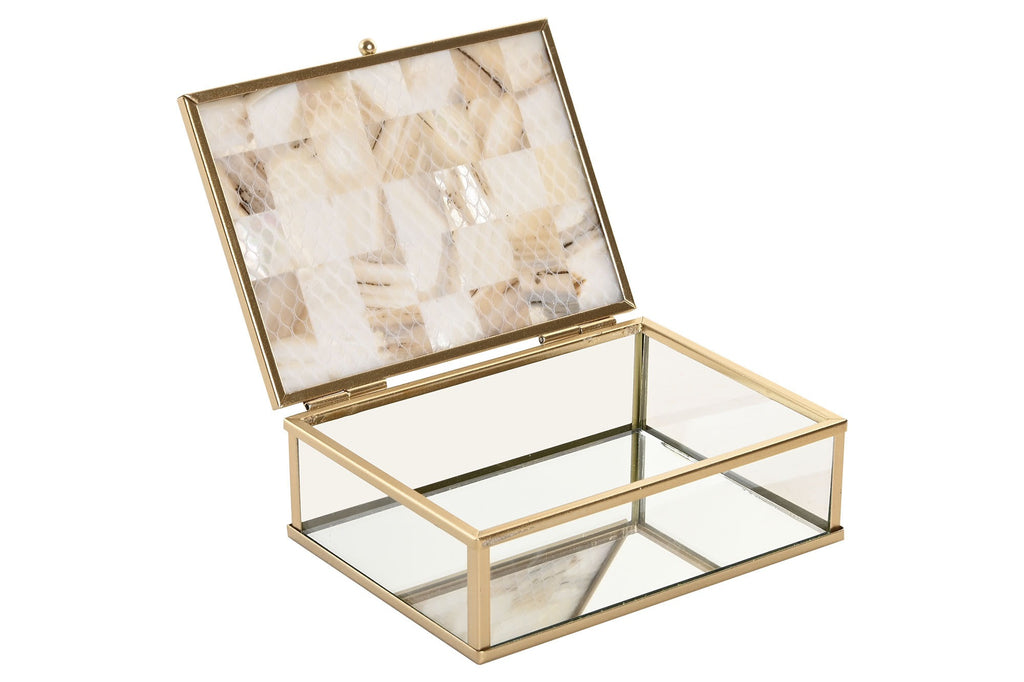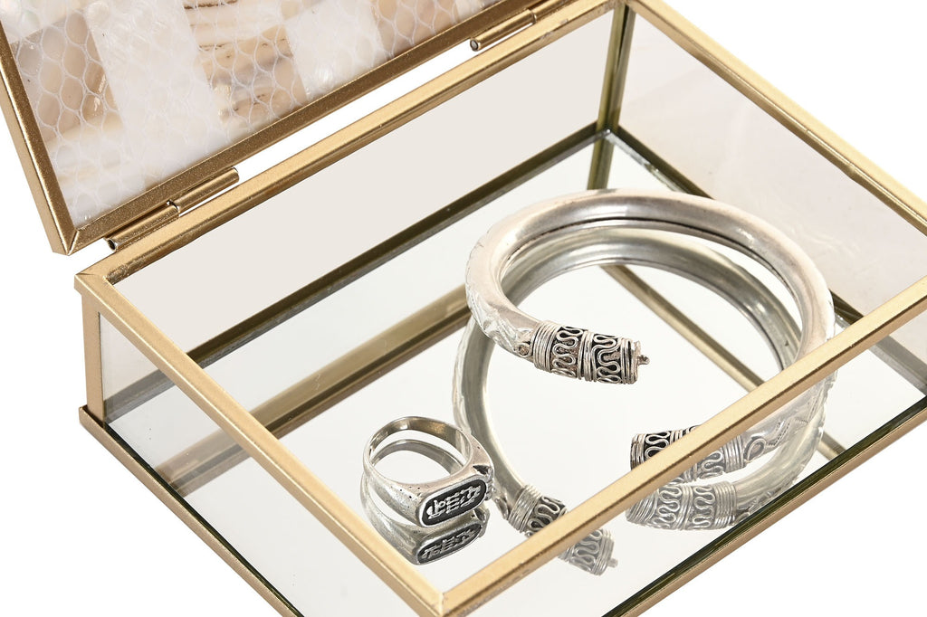 Hay objetos que no solo cumplen una función, sino que se convierten en pequeños tesoros decorativos. Esta caja joyero rectangular con tapa de nácar y cristal espejado es justo eso: una joya para tus joyas.