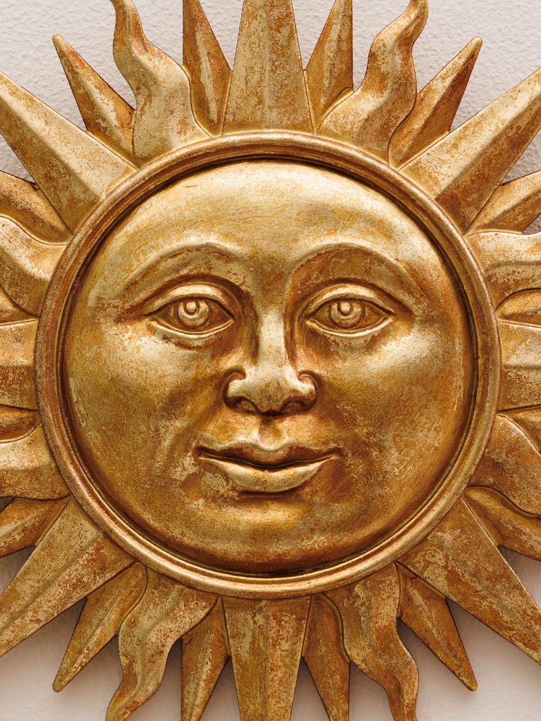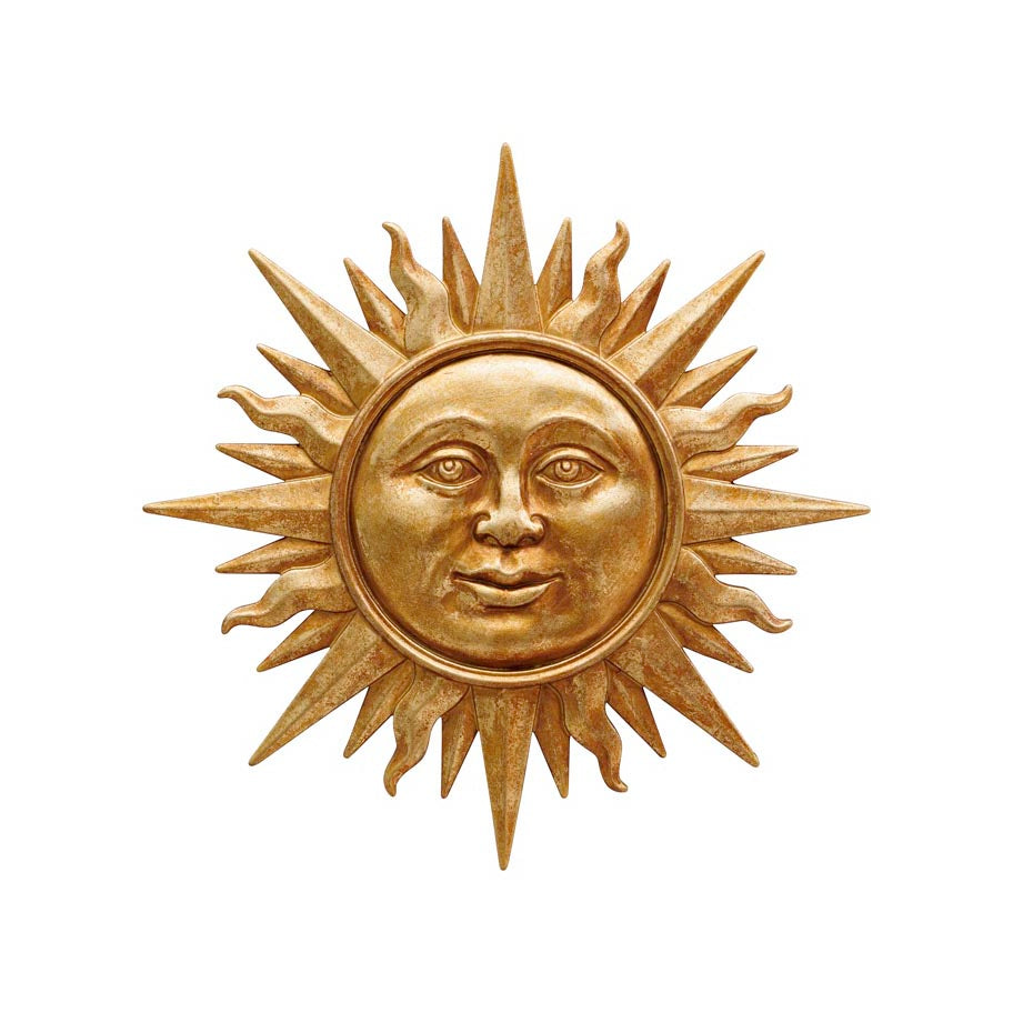 Sol decorativo de pared pequeño con rostro en acabado dorado envejecido