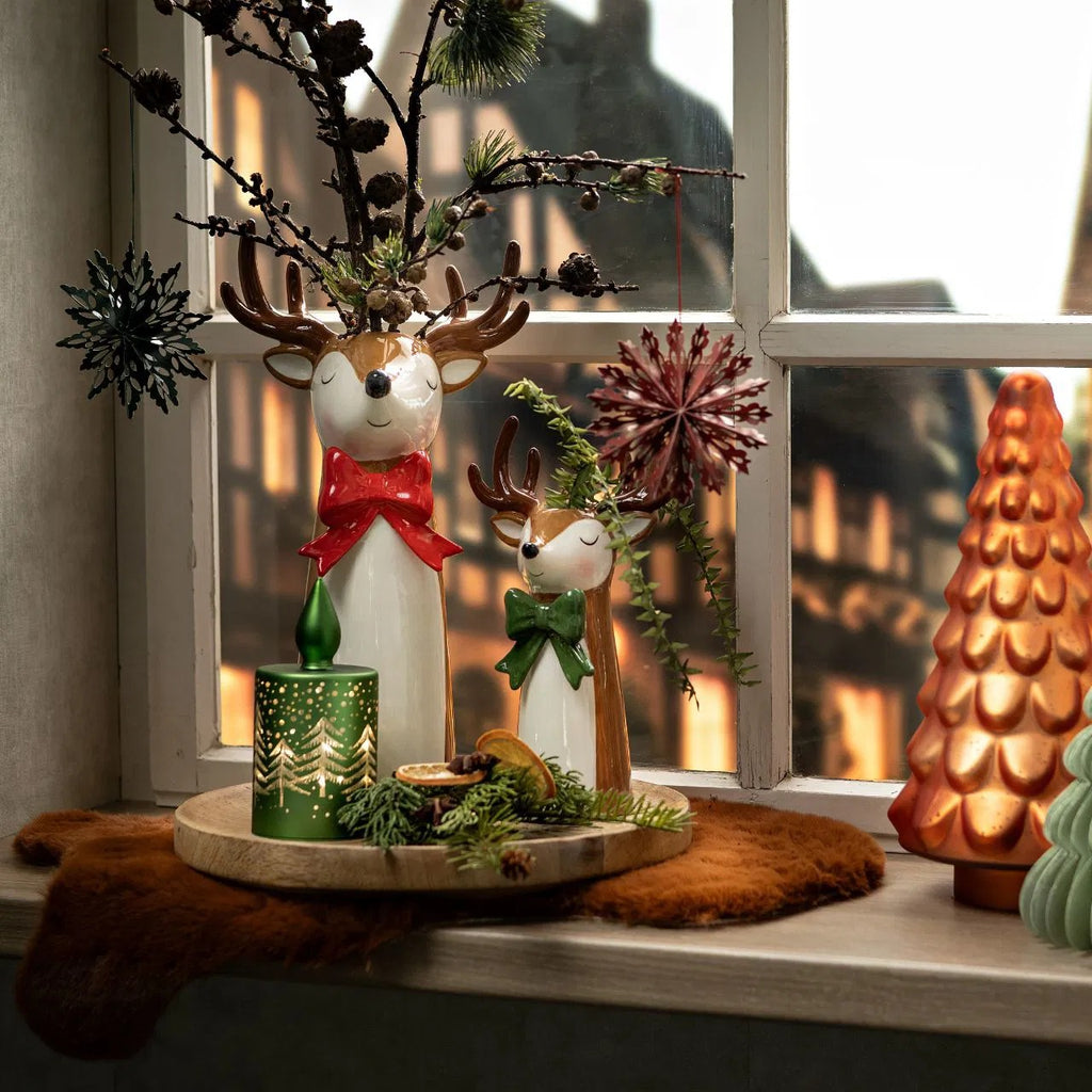 Crea un rincón navideño lleno de vida colocando este jarrón con forma de reno junto a velas doradas, pequeñas luces LED y figuras de cerámica de nuestra colección. También puedes usarlo como florero navideño con ramas de pino o eucalipto para aportar un toque natural y festivo a tu hogar.