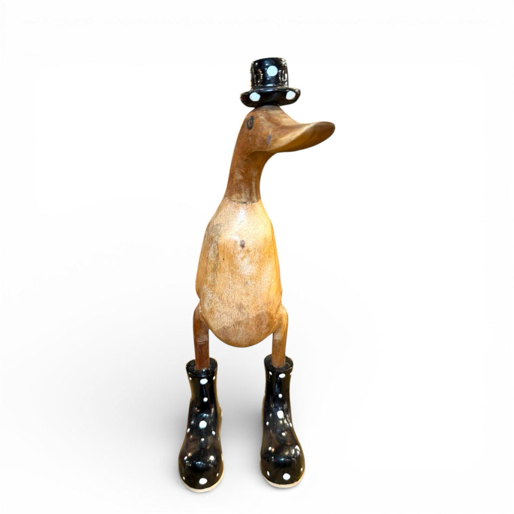 Dale un giro original y entrañable a tu decoración con esta figura decorativa de pato en madera de teca reciclada hecha a mano en Indonesia. Esta pieza, tallada con mimo y respeto por la naturaleza, nos presenta a un pato muy especial, vestido con botas negras de lunares y un simpático sombrero de copa a juego. ¡La elegancia y el buen humor nunca estuvieron tan bien combinados!