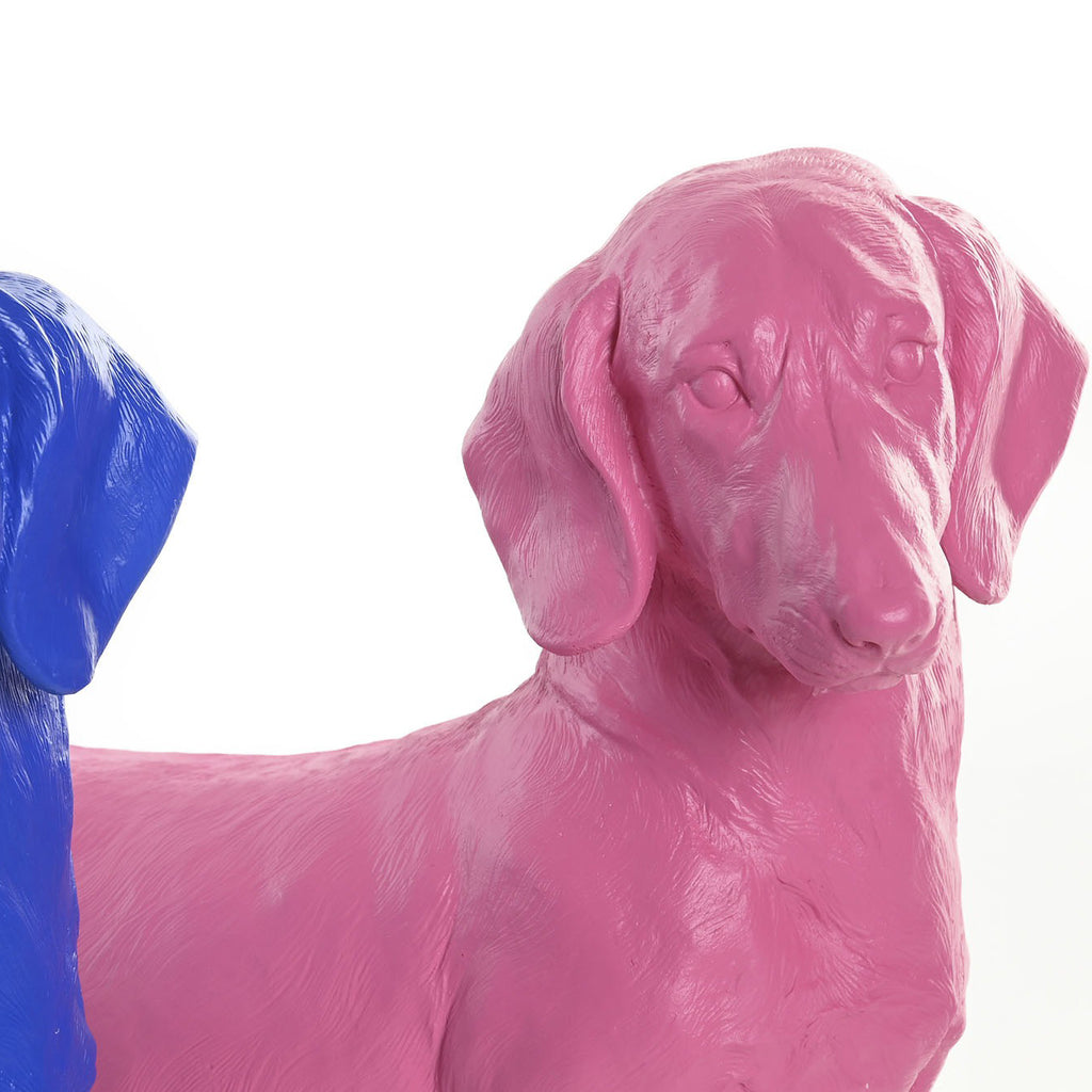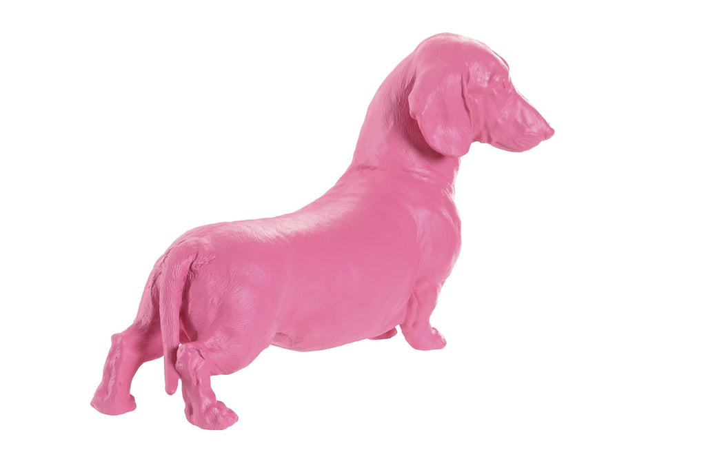 Realizada en resina de alta calidad con un acabado mate suave al tacto, esta escultura representa con gran realismo a un simpático dachshund, también conocido como perro salchicha, pintado completamente en un vibrante rosa chicle. Una propuesta estética única que rinde homenaje al pop art y que aporta vida a cualquier estancia.