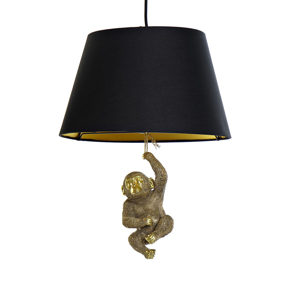 Lámpara colgante con mono dorado y pantalla negra – Estilo exótico y elegante