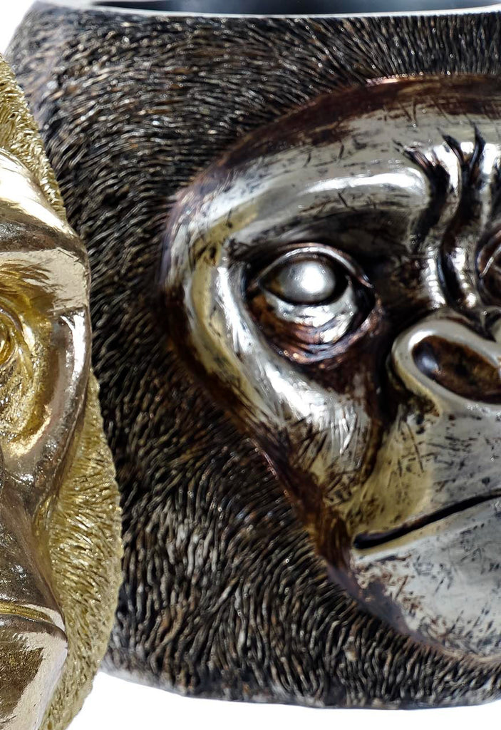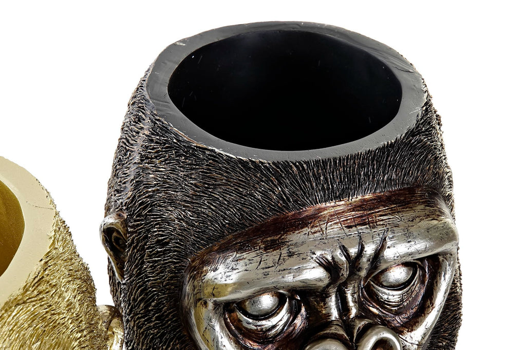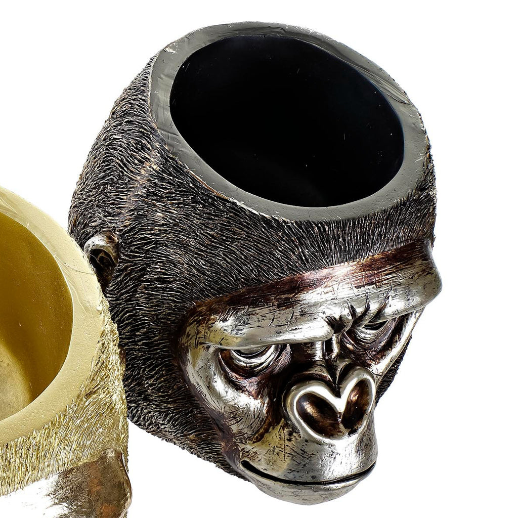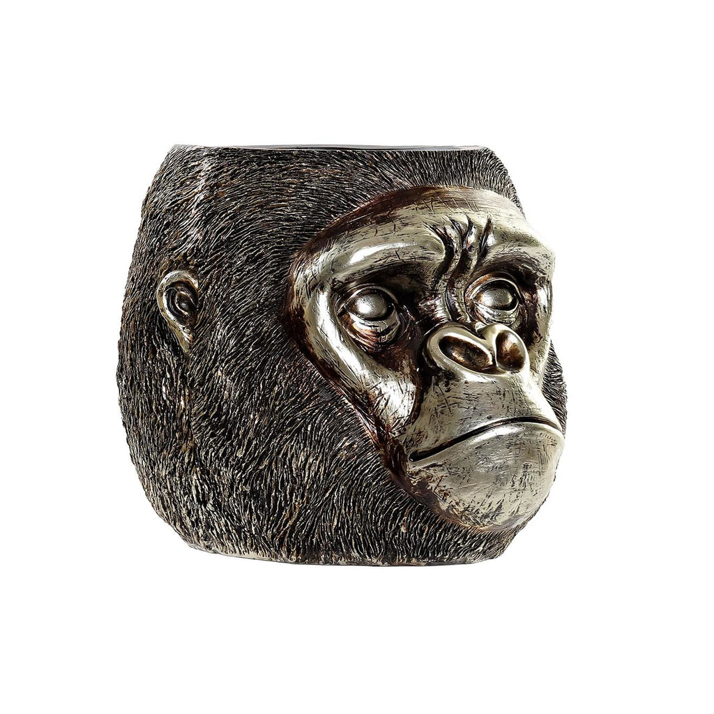 Este macetero decorativo con forma de cabeza de gorila destaca por su impresionante acabado en efecto metal envejecido, con contrastes entre tonos oscuros y reflejos plateados que aportan profundidad y realismo. La textura del pelaje y la expresividad del rostro lo convierten en una pieza casi escultórica, donde cada detalle ha sido trabajado para transmitir presencia y autenticidad.