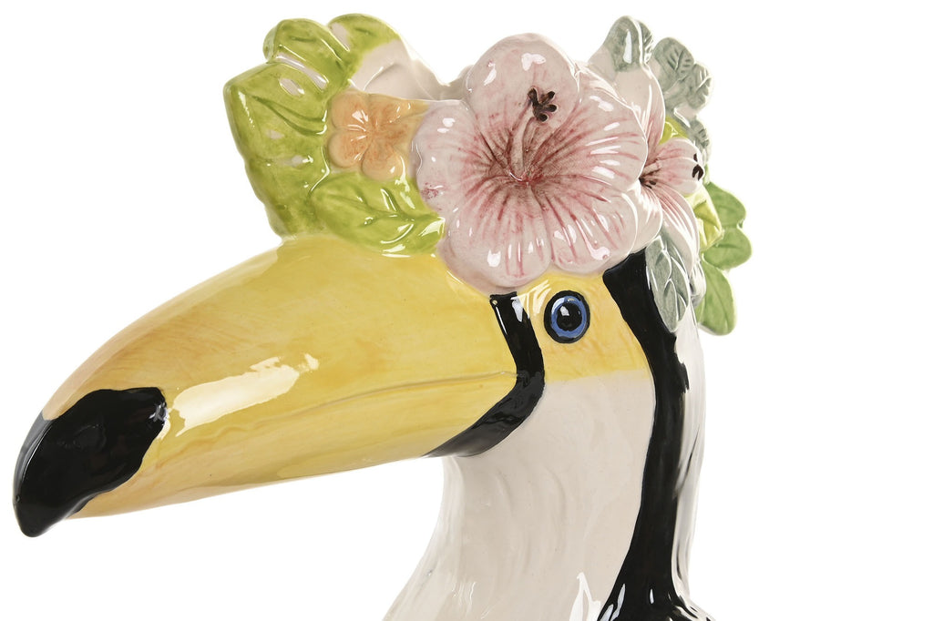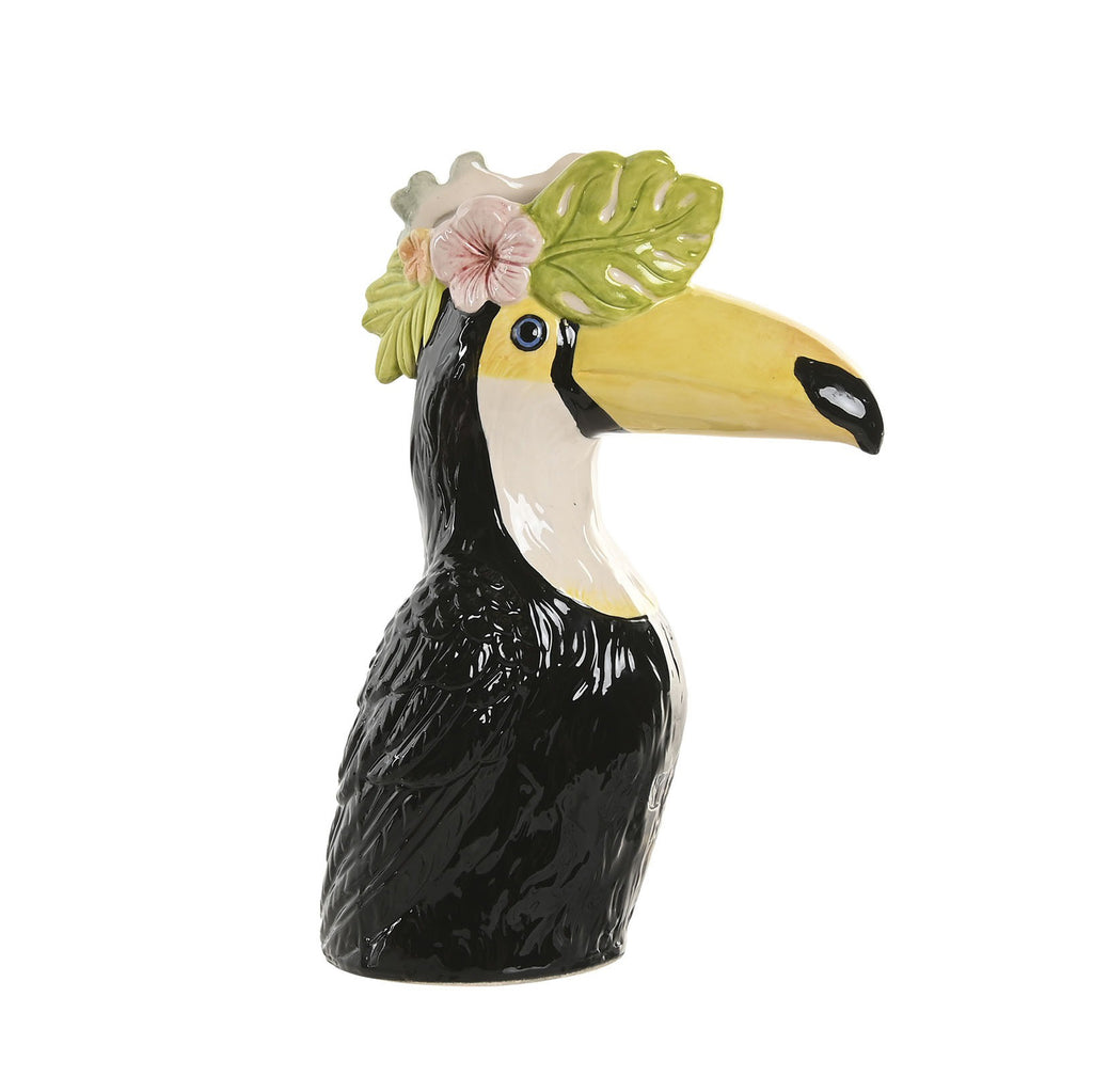 Hay objetos que roban miradas al instante, y este jarrón decorativo con forma de tucán tropical es uno de ellos. Con su estética atrevida, alegre y fresca, esta pieza de cerámica esmaltada representa a un simpático tucán de gran pico amarillo, decorado con una encantadora corona de hojas y flores tropicales en tonos pastel. Un homenaje al colorido de la naturaleza salvaje con un toque artístico muy actual.