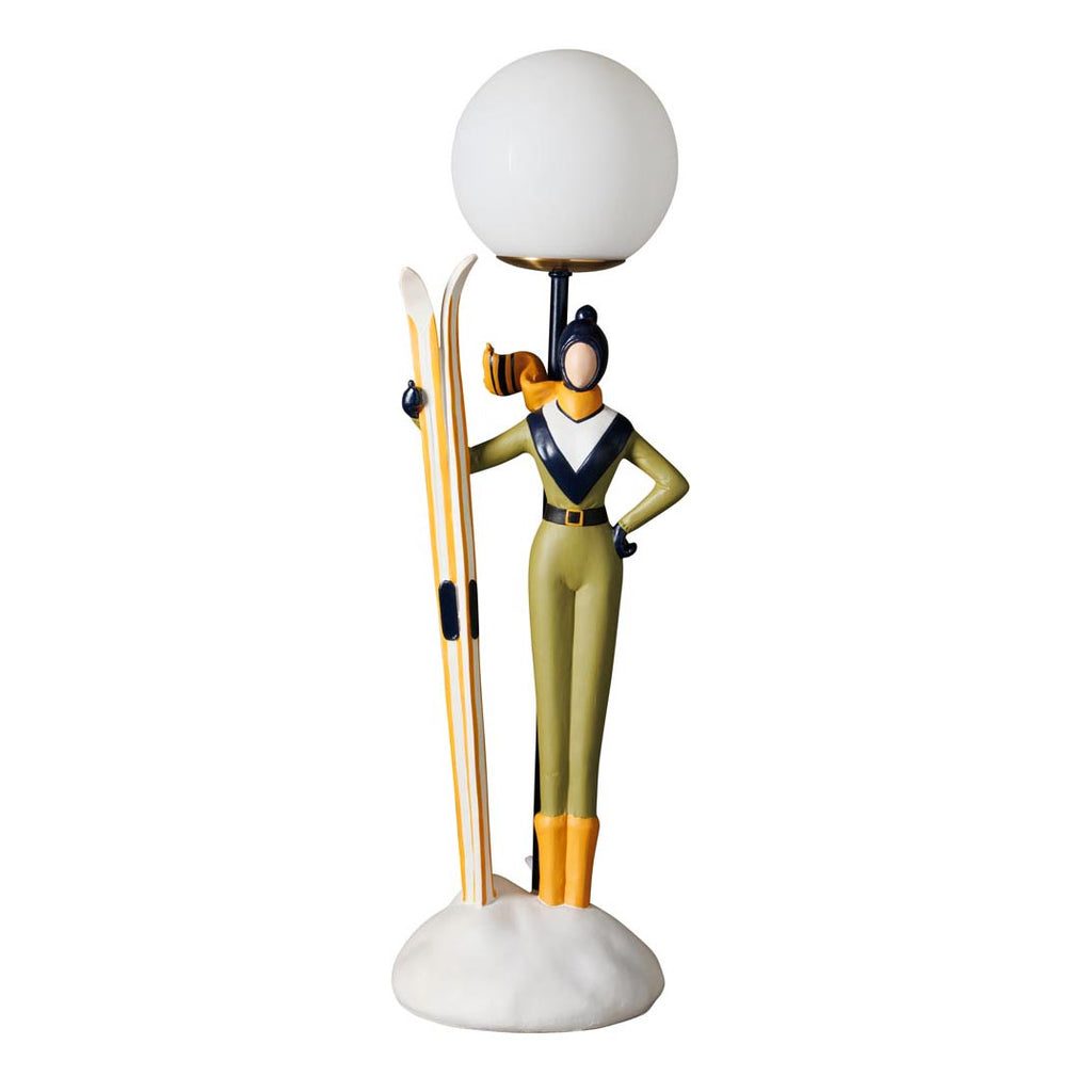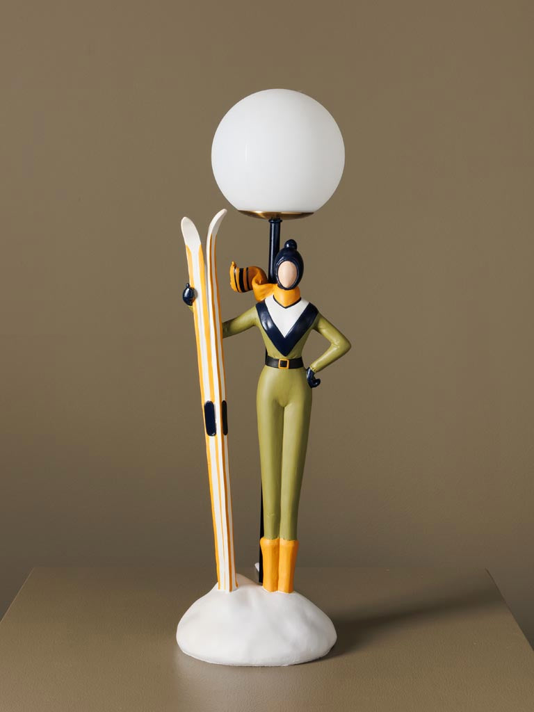La figura, que representa a una esquiadora de montaña con un look años 50, luce un mono verde olivo con cuello en V, botas naranja y una bufanda al viento, sujetando sus esquís junto a un montículo de nieve. En lugar de gorro, lleva como sombrero una pantalla esférica opalina que funciona como difusor de luz, proporcionando una iluminación suave y envolvente ideal para crear ambientes cálidos.