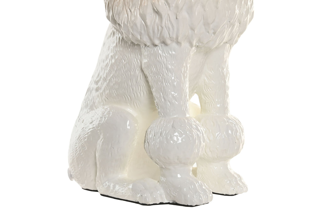 Su base está completamente formada por una figura de caniche blanco de resina esmaltada, rica en texturas y detalles, que sobresale con elegancia por encima y por debajo de la pantalla. La pantalla cilíndrica blanca, con interior dorado, añade un contraste cálido y sofisticado al encender la luz, proyectando un halo acogedor que realza cualquier rincón donde se coloque.
