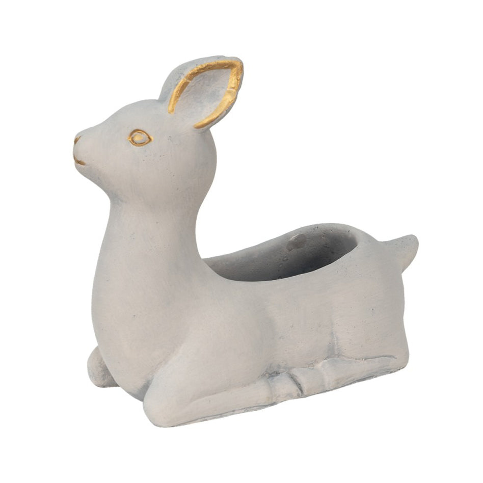 Este macetero decorativo con forma de ciervo de cemento gris claro es una de esas piezas que no pasan desapercibidas. Su diseño minimalista, pero cargado de encanto, lo convierte en un objeto decorativo ideal para interiores y exteriores con alma. Inspirado en la figura serena de un pequeño ciervo acostado, este accesorio combina la sobriedad del cemento con detalles dorados en orejas y ojos que aportan una nota cálida y sofisticada.