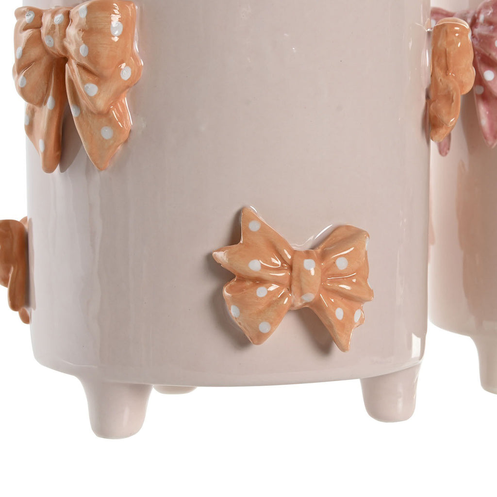 Su diseño cilíndrico con patitas cortas le aporta estabilidad y un aire moderno, mientras que los lazos de cerámica en tono melocotón con lunares blancos, distribuidos por toda la superficie, lo convierten en una pieza encantadora, llena de textura y volumen. Cada lazo está cuidadosamente moldeado y esmaltado, haciendo que este macetero no pase desapercibido.