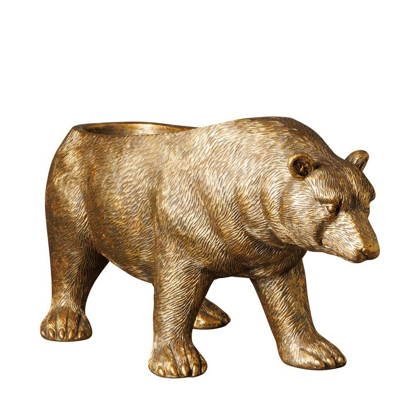 Fabricado en resina con un acabado dorado texturizado que simula el pelaje del animal, este oso decorativo multifunción tiene presencia y carisma. Puedes usarlo para presentar una botella de vino o champagne con hielo, pero también como macetero para plantas secas, jarrón de flores artificiales o simplemente como una figura escultórica que aportará carácter a cualquier estancia.