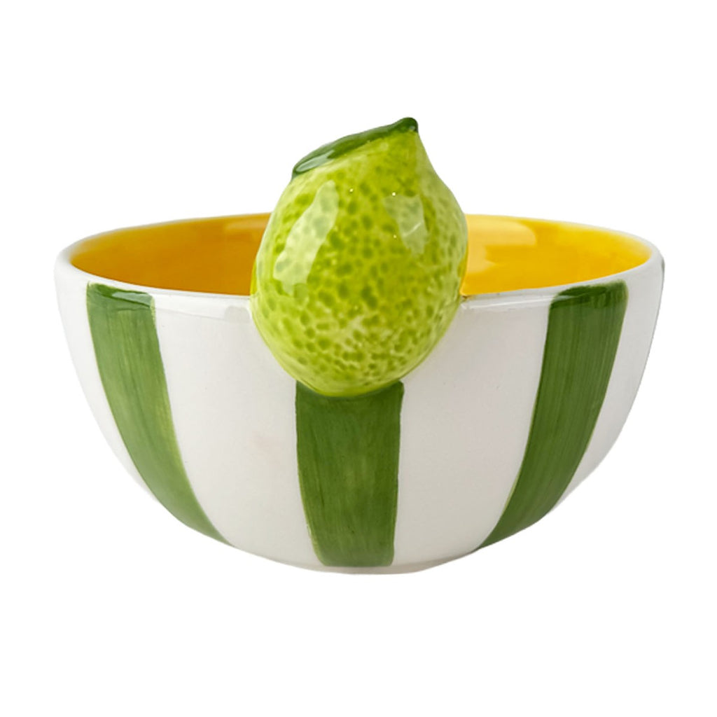 Este bol de cerámica con lima en relieve y rayas verdes pintadas a mano es el detalle perfecto para llenar tu mesa de color, frescura y buen gusto.