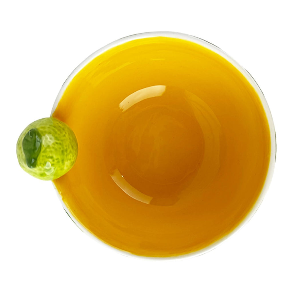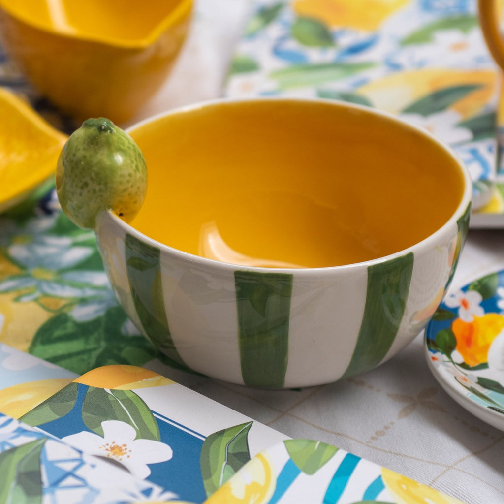 Con un interior esmalte amarillo vibrante y un diseño exterior en blanco con pinceladas verdes verticales, esta pieza combina artesanía y alegría mediterránea. El detalle estrella es, sin duda, la lima cerámica modelada y esmaltada, cuidadosamente colocada en el borde exterior, aportando un guiño juguetón y veraniego al conjunto.