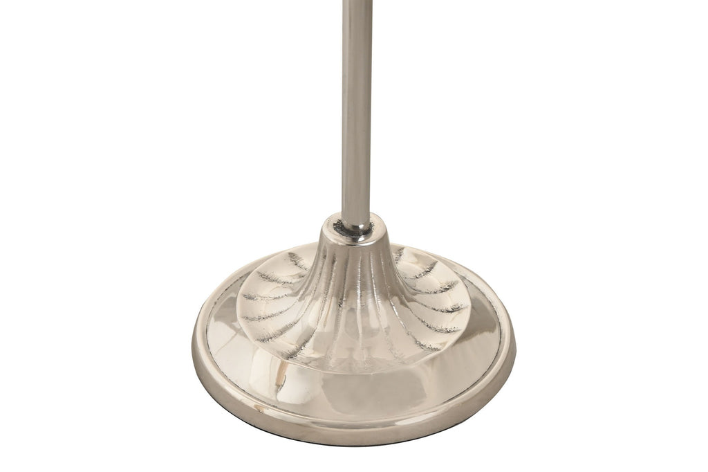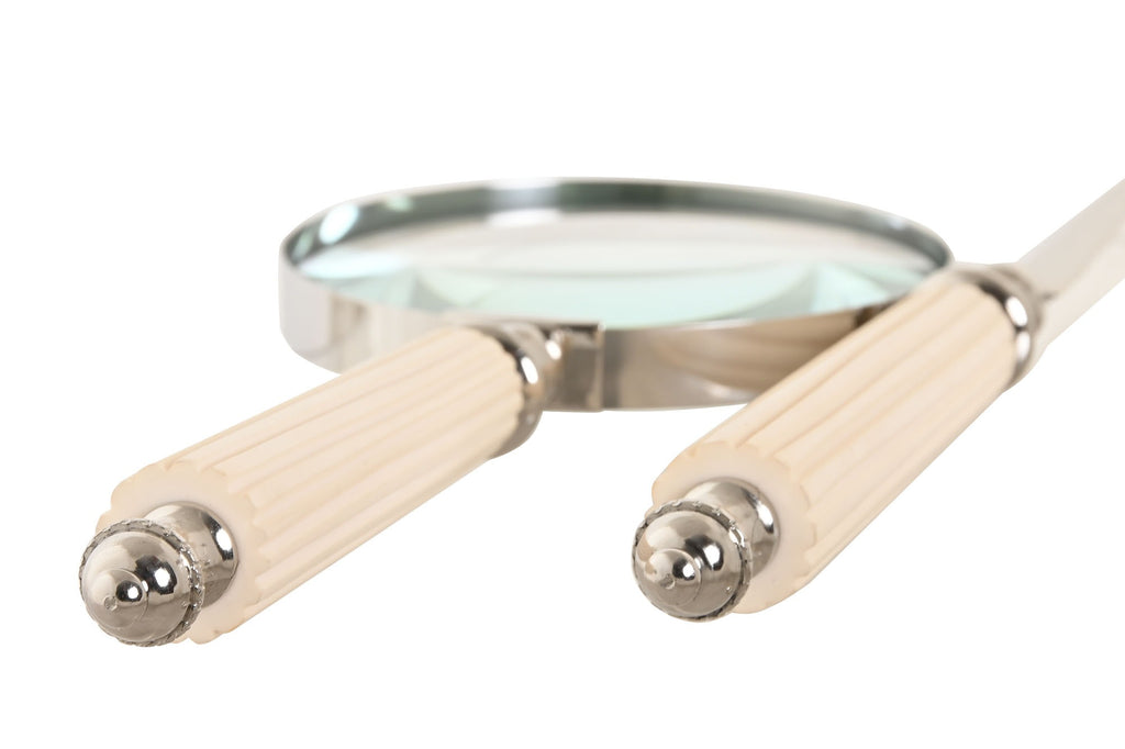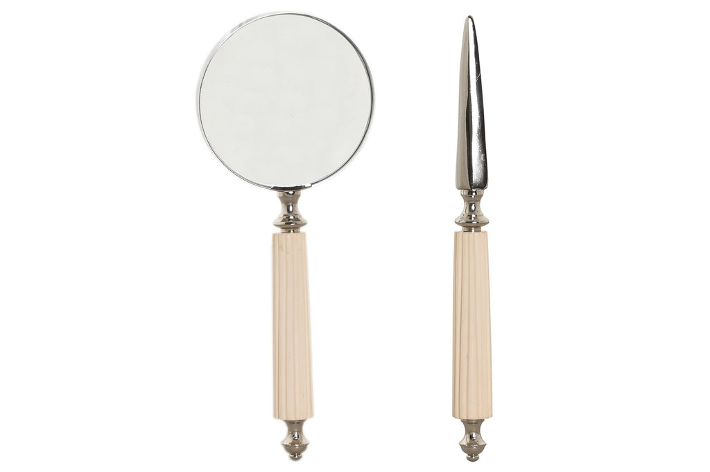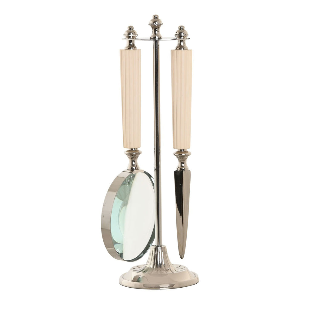 Compuesto por una lupa de aumento de cristal grueso y un abrecartas con filo metálico pulido, ambos lucen mangos estriados en acabado marfil con detalles cromados, un guiño sutil al art déco y al estilo retro refinado. El soporte a juego, también cromado, mantiene las piezas perfectamente suspendidas, convirtiéndolas en una auténtica escultura de escritorio funcional.