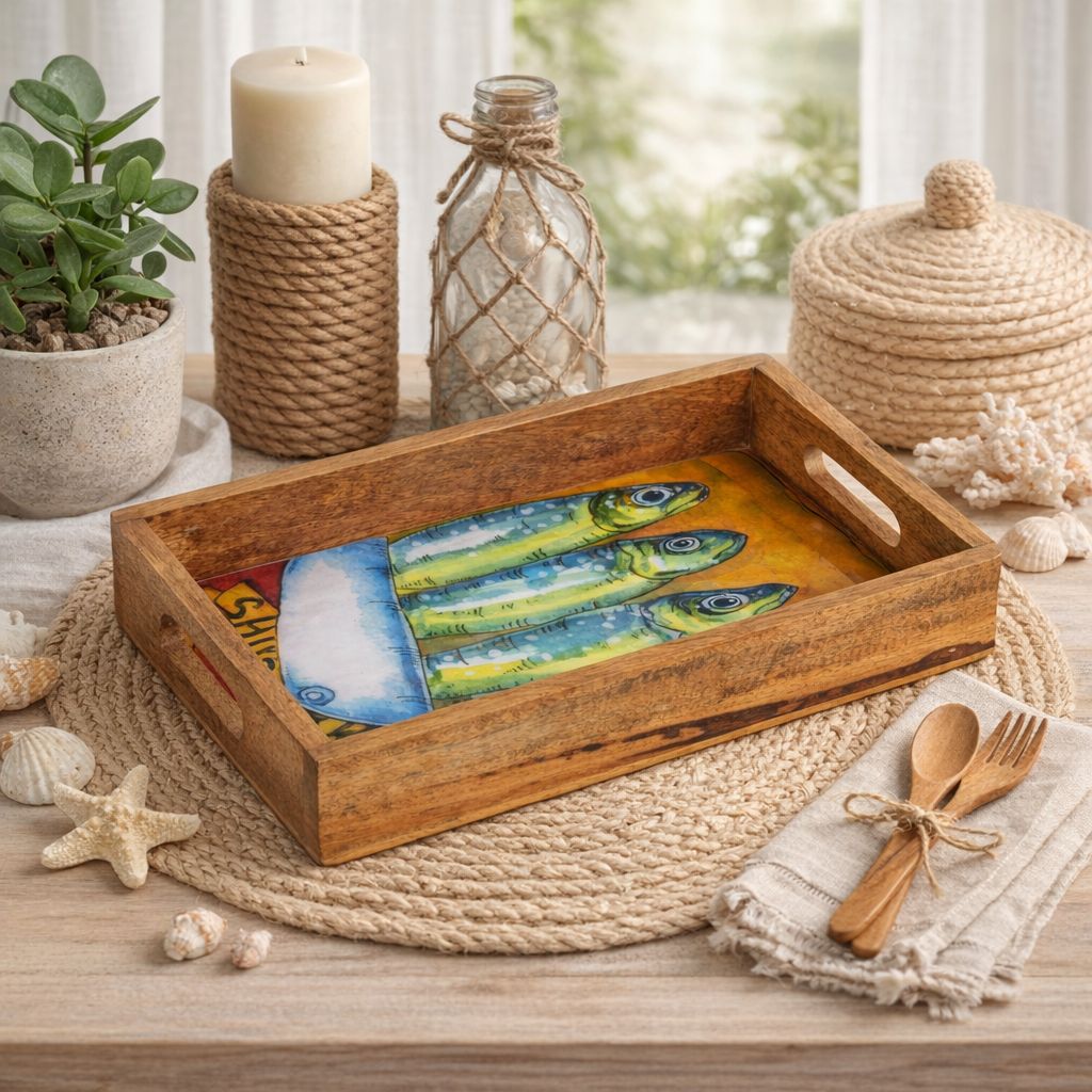 Esta bandeja de madera natural con ilustración de sardinas estilo vintage es pura esencia mediterránea. Su diseño evoca las antiguas latas de conserva, los mercados del puerto, las sobremesas infinitas y el olor a salitre. Es alegre, artística y con personalidad. No pasa desapercibida.