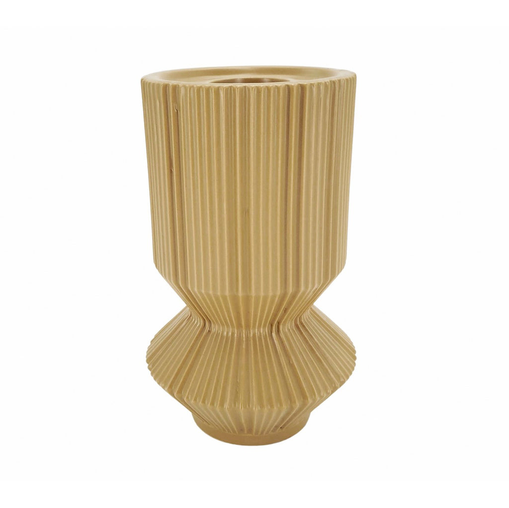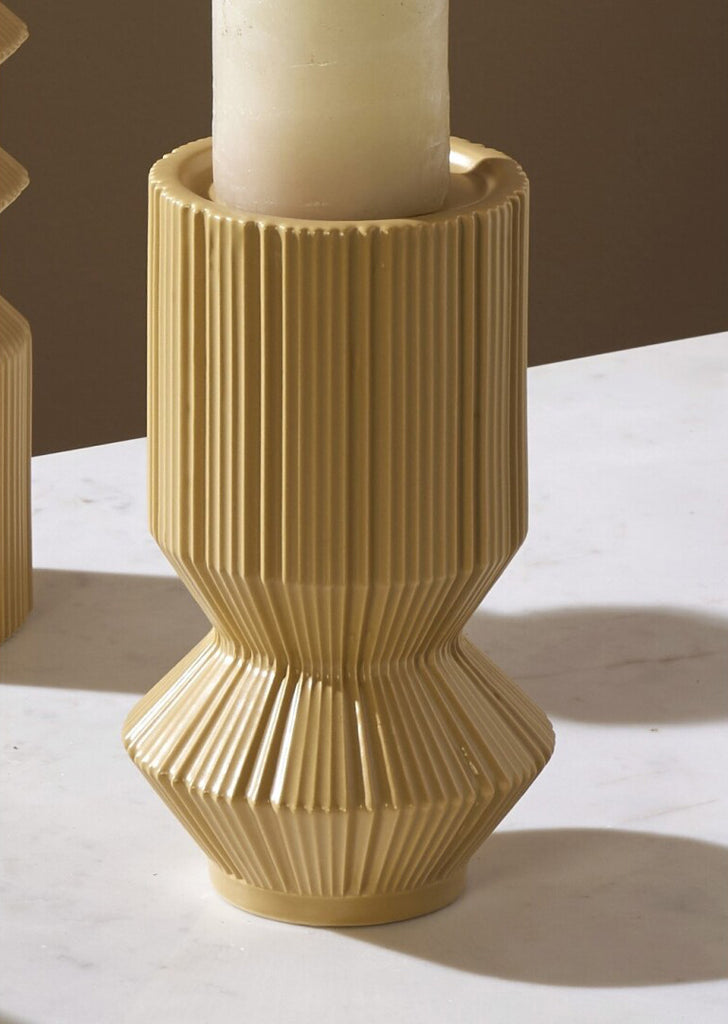 Este candelabro decorativo estriado color mostaza destaca por su silueta arquitectónica y su textura vertical acanalada que juega con la luz y las sombras. Su diseño combina líneas rectas en la parte superior con un volumen central más marcado y geométrico, creando un equilibrio muy atractivo entre modernidad y carácter atemporal.