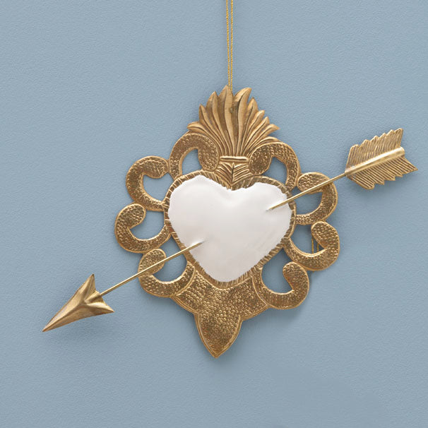 Este exvoto corazón de metal blanco y dorado con flecha es una pieza cargada de simbolismo y belleza artesanal. Inspirado en los tradicionales exvotos religiosos, representa la entrega, la devoción y el amor eterno. Su diseño combina un corazón esmaltado en blanco —símbolo de pureza— atravesado por una flecha dorada que evoca pasión, destino y fe.