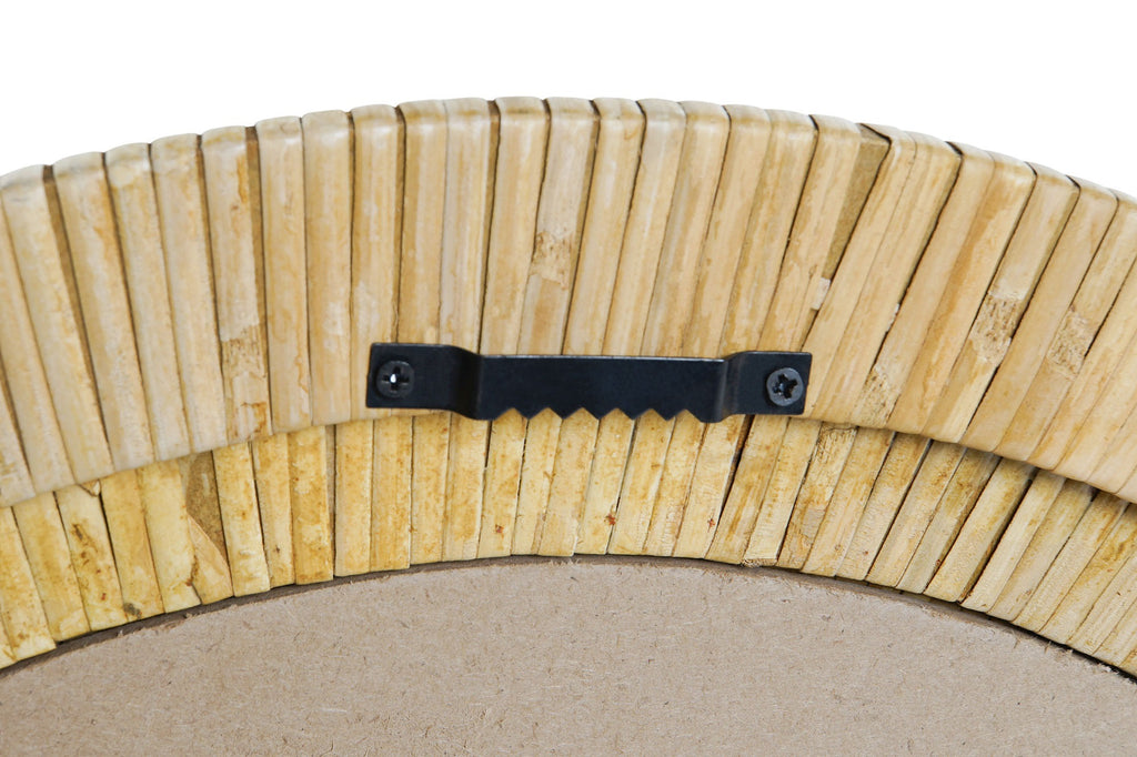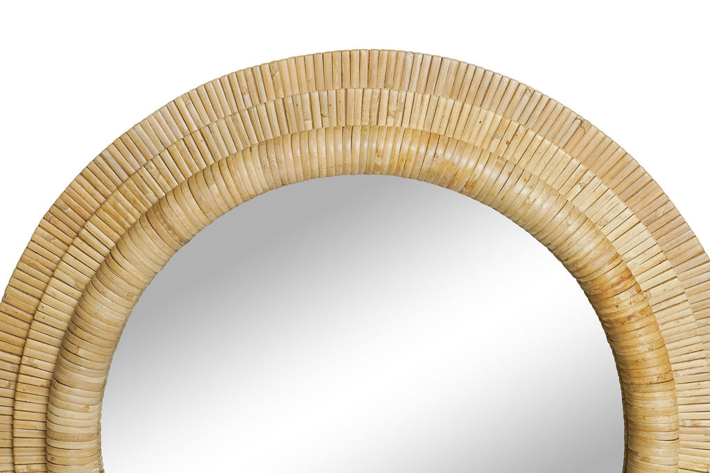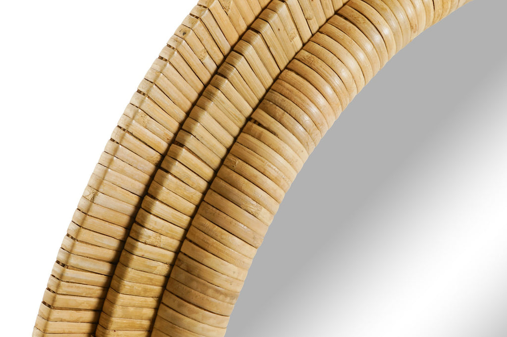 El marco está elaborado con ratán natural dispuesto en delicadas secciones circulares que crean una textura muy especial. Este trabajo artesanal aporta profundidad visual y una estética orgánica que conecta inmediatamente con ambientes relajados, luminosos y naturales.