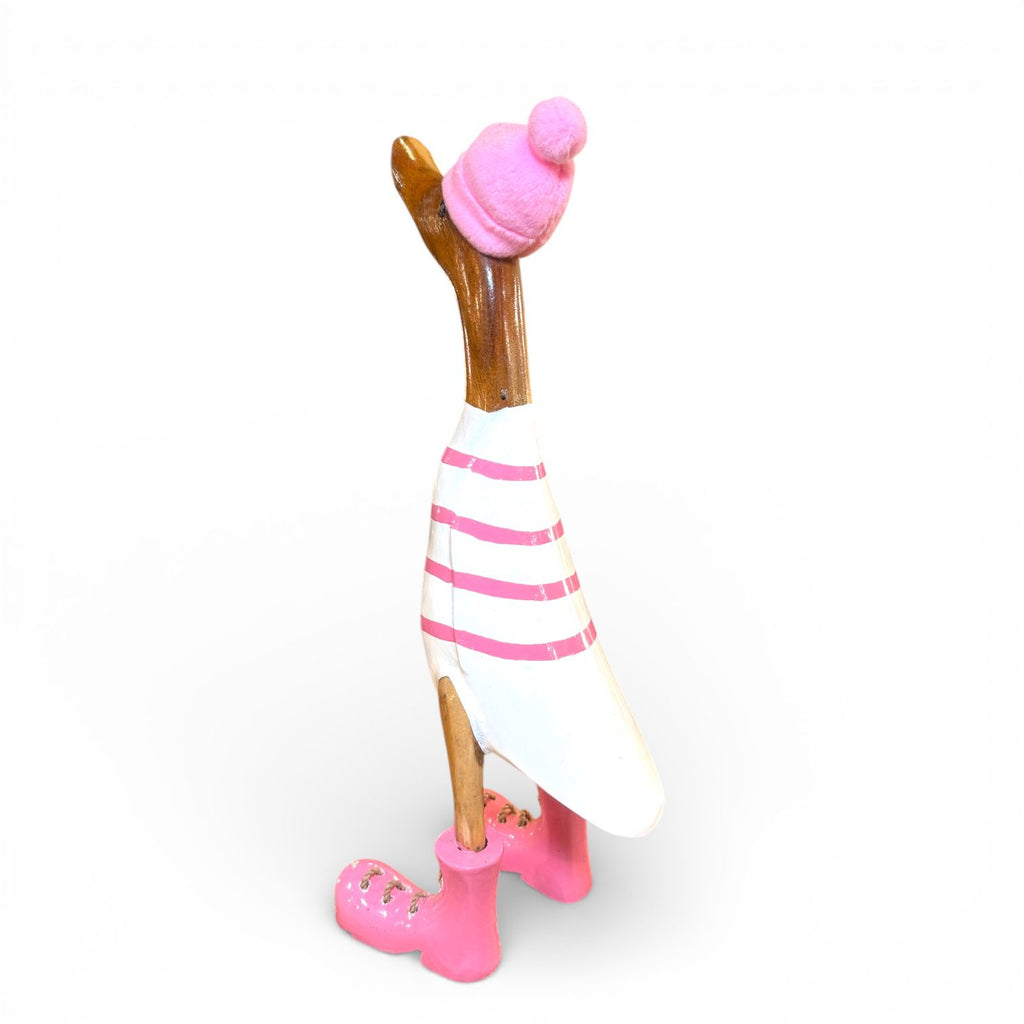Cada pieza está hecha a mano en Indonesia a partir de madera de teca reciclada, lo que la convierte en una opción sostenible y única. Ningún pato es igual a otro, y esa imperfección es su mayor encanto. Está pintado con esmero, con un jersey de rayas blancas y rosas, botas a juego y un gorro de lana con pompón que lo hace todavía más adorable.