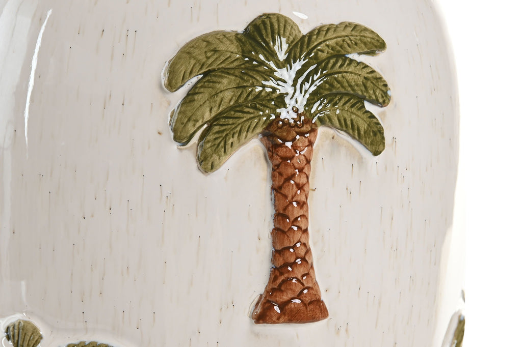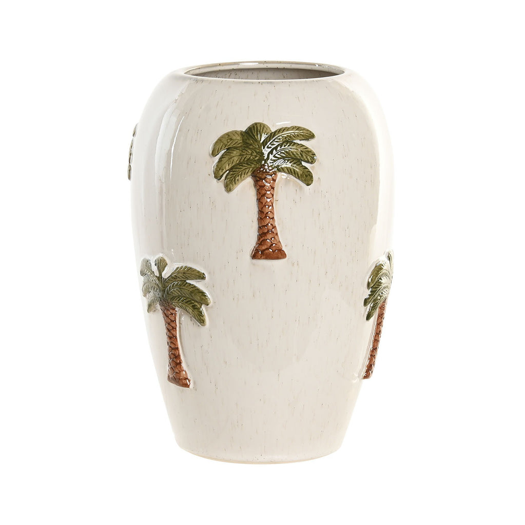 Las palmeras en relieve distribuidas por todo el cuerpo del jarrón están pintadas a mano en tonos verdes y marrones cálidos, aportando textura, color y un guiño nostálgico a las vacaciones eternas junto al mar. Su base en tono beige desgastado imita el acabado envejecido de los objetos recuperados, lo que lo hace ideal para entornos de inspiración mediterránea, boho o costera vintage.