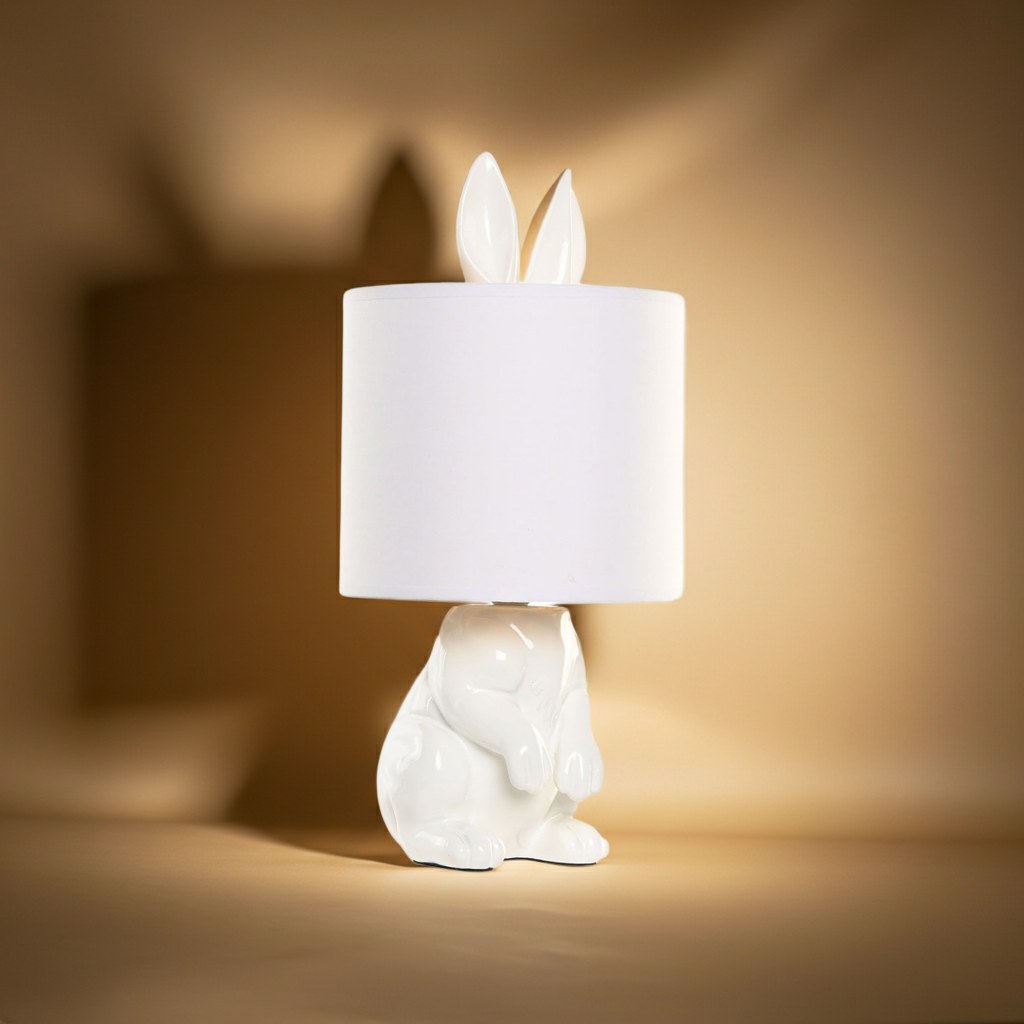 Esta lámpara de mesa con base de conejo blanco es perfecta para quienes buscan algo diferente, especial y con un punto divertido sin perder elegancia. Su base representa un conejo sentado en acabado blanco brillo, mientras que sus orejas asoman por encima de la pantalla, creando un efecto visual sorprendente y encantador.