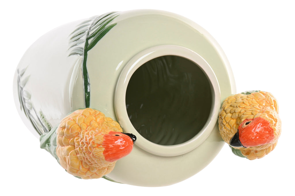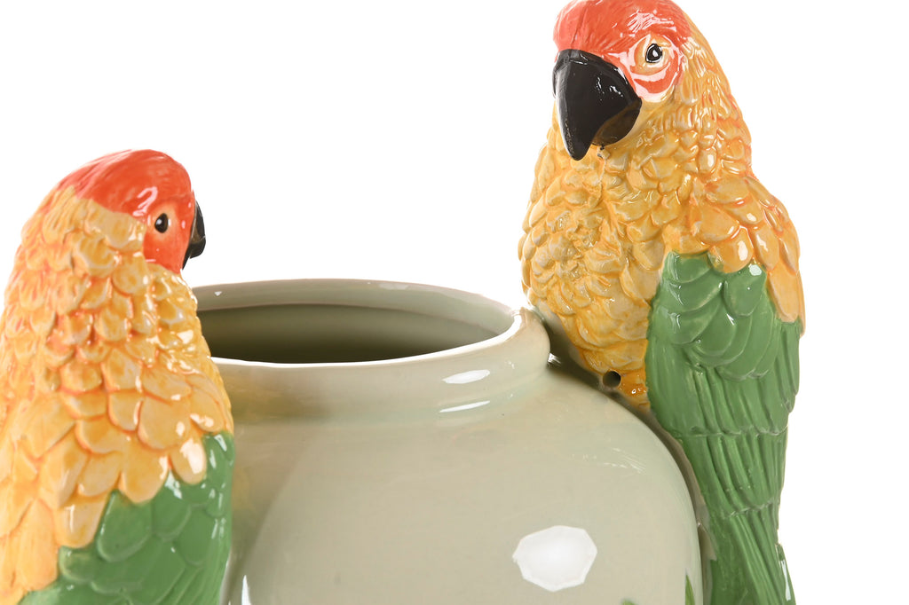 O seu design combina uma base verde suave com relevos de folhas tropicais e dois papagaios meticulosamente esculpidos, com plumagem em tons de verde, amarelo e coral. A textura das penas, o brilho do esmalte e o volume das figuras conferem a esta peça uma presença real, quase escultural. Não é apenas mais um vaso: é um elemento decorativo marcante.